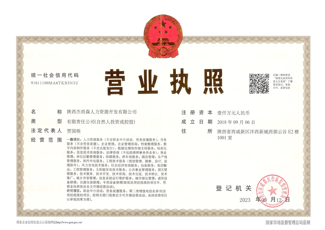 陜西杰而森人力資源開(kāi)發(fā)有限公司成立于2018年,是一家以人力資源服務(wù)為主業(yè)的市場(chǎng)化專(zhuān)業(yè)機(jī)構(gòu)。公司總部位于陜西省西咸新區(qū)秦創(chuàng)原人才大市場(chǎng),下設(shè)6家分子公司。公司的主營(yíng)業(yè)務(wù)包括:勞務(wù)派遣、勞務(wù)外包、業(yè)務(wù)流程外包、招聘、培訓(xùn)、檔案整理和電子化等服務(wù)。